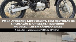 Polícia PMBA apreende motocicleta com restrição de circulação e apresenta indivíduo na delegacia de Cândido Sales 3 semanas atrás