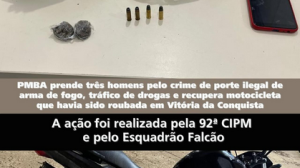 Polícia Policiais da 92 CIPM e do Esquadrão Falcão prendem três homens por porte ilegal de arma de fogo, tráfico de drogas e recupera moto roubada 2 meses atrás