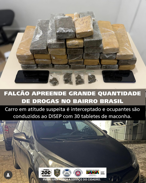 Na abordagem, foram encontradas porções de maconha com os ocupantes, que levaram à descoberta de 30 tabletes da droga, acondicionados em duas caixas.