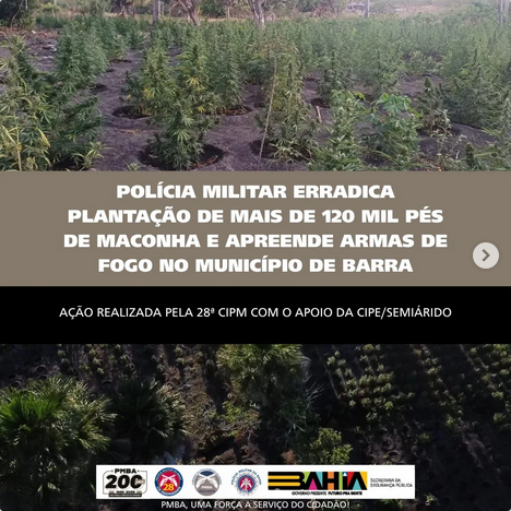 Policiais Militares da 28ª CIPM/Ibotirama e da CIPE Semiárido erradicaram uma plantação de maconha com 120 mil pés, apreenderam 300kg de droga já colhida e armas de fogo, na zona rural do município de Barra, próximo à divisa com Pilão Arcado.