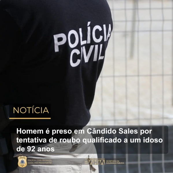 A Polícia Civil da Bahia, por meio da Delegacia Territorial de Cândido Sales, cumpriu, na manhã desta quarta-feira (2), mandado de prisão preventiva contra um homem de 21 anos, suspeito de tentativa de roubo qualificado a um idoso de 92 anos, ocorrido no povoado de Lagoa Grande, zona rural do município.