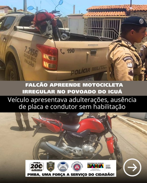 Durante patrulhamento no Povoado do Iguá, as guarnições do Esquadrão Falcão apreenderam uma motocicleta com diversas irregularidades, incluindo ausência de placa, IPVA atrasado e adulterações nas características do veículo.