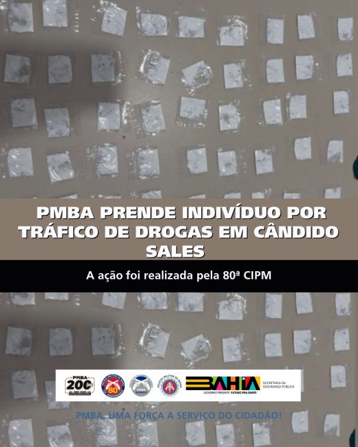Neste sábado (18), às 15h, na cidade de Cândido Sales, a guarnição do PETO realizava rondas pelo bairro usina, quando avistou um indivíduo, que ao visualizar a viatura, dispensou um saco preto e tentou empreender fuga, contudo, foi alcançado pela guarnição. Ao realizar busca pessoal e no perímetro foi encontrado um saco preto contendo 46 papelotes de substância análoga a cocaína. Diante das circunstâncias, o indivíduo e o Material ilícito foram apresentados no DISEP para adoção das medidas cabíveis.