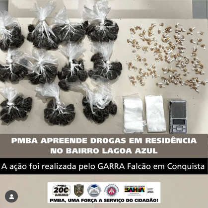 Durante o patrulhamento, o GARRA do Esquadrão Falcão foi acionado pelo CICOM após denúncia de tráfico de drogas em uma casa no condomínio Lagoa Azul, em Vitória da Conquista.