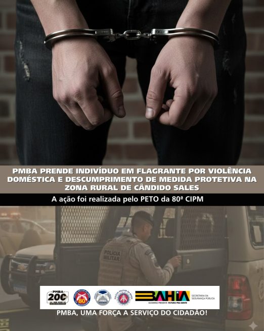 Na manhã de quinta-feira (29), a Polícia Militar foi acionada pela Central de Comunicações após uma denúncia de possível cárcere privado e descumprimento de medida protetiva de urgência em um povoado da zona rural de Cândido Sales. Diante disso, a guarnição deslocou-se imediatamente ao local indicado, onde confirmou a veracidade da situação relatada. Durante a ação, a vítima informou que vinha sendo impedida de sair da residência pelo companheiro, além de relatar ameaças de morte feitas com o uso de um objeto cortante, estendidas também a um familiar. Em seguida, o suposto autor foi localizado no imóvel, sendo realizada a abordagem e a busca pessoal, sem a localização de materiais ilícitos. Além disso, a vítima apresentou a medida protetiva vigente e manifestou interesse em representar criminalmente pelos fatos narrados. Assim, diante dos indícios de crime e do descumprimento da ordem judicial, o indivíduo foi detido e conduzido para adoção das medidas legais cabíveis, permanecendo custodiado após a lavratura do flagrante.