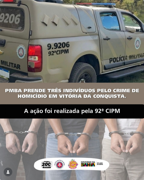 Na tarde deste domingo (15), policiais militares da 92ª CIPM realizaram a prisão em flagrante de três indivíduos suspeitos de envolvimento em um homicídio ocorrido no último dia 14 de fevereiro, no bairro Espírito Santo, em Vitória da Conquista.