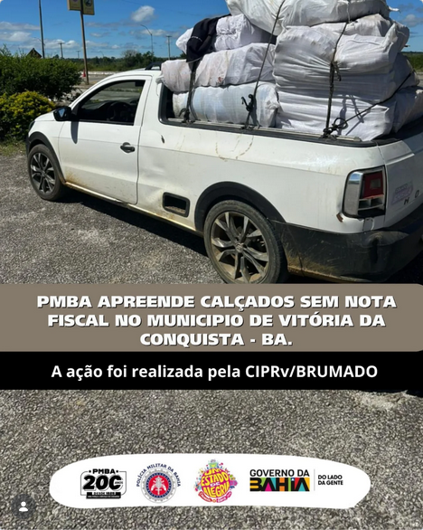 A ação ocorreu na tarde deste domingo (15), por volta das 14hs50, no Município de Vitória da Conquista – BA, pela equipe do Posto do Marçal, com a apresentação de dezesseis sacos contendo calçados diversos ao SEFAZ, posto Benito Gama em Vitória da Conquista, para adoção das providências legais cabíveis..