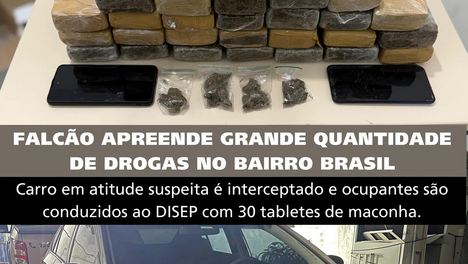 Na abordagem, foram encontradas porções de maconha com os ocupantes, que levaram à descoberta de 30 tabletes da droga, acondicionados em duas caixas.