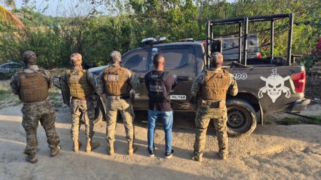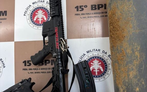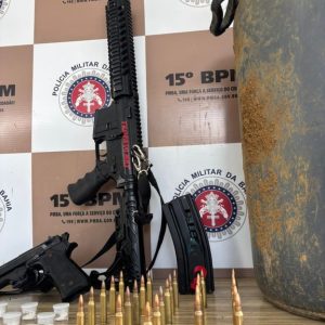 Durante as buscas, foram localizados um recipiente enterrado contendo um fuzil municiado, além de um simulacro de pistola e substâncias...