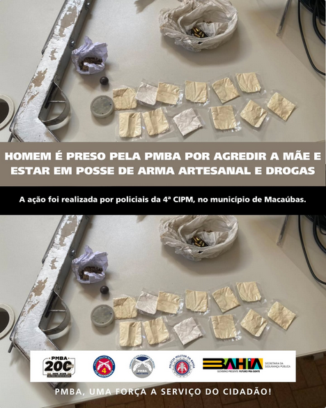 No local, a genitora não foi encontrada, porém o suspeito foi localizado e, ao ser questionado sobre a arma, informou que estava embaixo do colchão. Durante a busca, os policiais encontraram uma espingarda artesanal e, junto a ela, dez papelotes de substâncias análogas à cocaína e à maconha.