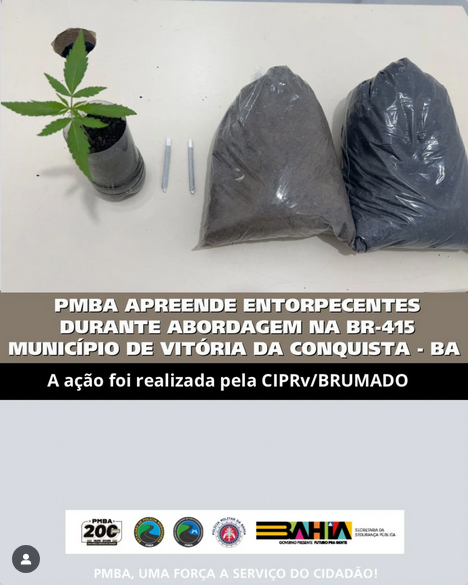 No dia deste Sábado (04/10), às 11h00, Policiais Militares da Companhia Independente de Polícia Rodoviária, (CIPRv/BRUMADO), Guarnição do Posto de Barrocas/Marçal apreenderam entorpecentes durante abordagem na BR-415 Município de Vitória da Conquista- BA.
