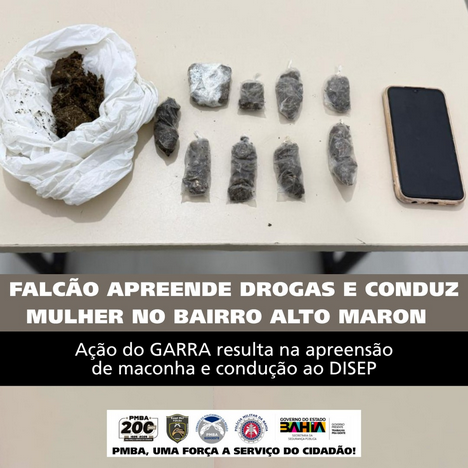 Durante rondas no bairro Alto Maron, uma equipe do GARRA localizou uma mulher com diversas porções de maconha, totalizando aproximadamente 150 gramas.