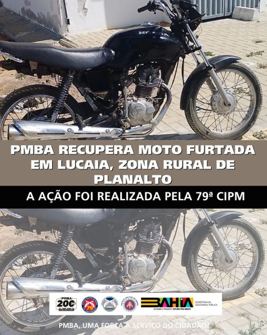 No último sábado (18), policiais militares da 79ª CIPM foram acionados pela Central de Operações (CENOP) para averiguar a informação de uma motocicleta que teria sido furtada dias antes e estaria circulando pelo distrito de Lucaia, zona rural do município de Planalto.