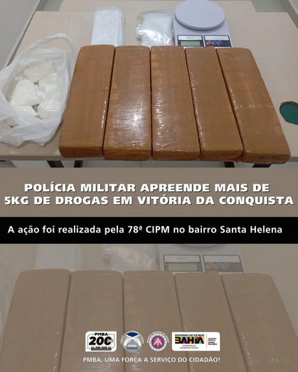Policiais militares da 78ª Companhia Independente de Polícia Militar (CIPM) apreenderam aproximadamente 5,3 quilos de drogas durante uma ação realizada na noite de terça-feira (29/10), no bairro Santa Helena, em Vitória da Conquista, no sudoeste baiano.