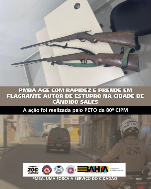 Na madrugada de domingo (01), a Polícia Militar da Bahia, por meio de guarnição do PETO da 80ª CIPM, foi acionada após denúncia de uma suposta ocorrência de estupro no povoado Lagoa do Timóteo, zona rural do município de Cândido Sales. Conforme as informações iniciais, a vítima teria sido abordada pelo indivíduo durante o retorno de um evento festivo, ocasião em que houve tentativa de violência sexual em local isolado. Diante disso, a guarnição iniciou diligências na localidade indicada, realizando buscas e levantamentos, logrando êxito em localizar o indivíduo em sua residência. Durante a ação, foram encontrados indícios relacionados à ocorrência, bem como armas de fabricação artesanal em sua posse. Posteriormente, as partes foram conduzidas à unidade policial competente para adoção das medidas legais cabíveis. Diante dos indícios colhidos durante a ação, o indivíduo foi flagranteado, permanecendo custodiado.