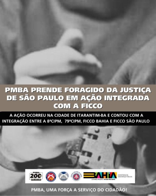 A ação ocorreu no município de Itarantim/BA. O indivíduo era foragido da Justiça do Estado de São Paulo, com mandado expedido pelo crime de tráfico de drogas. Após a localização, o homem foi preso e conduzido à autoridade policial competente para o devido cumprimento do mandado judicial e adoção das medidas legais cabíveis.
