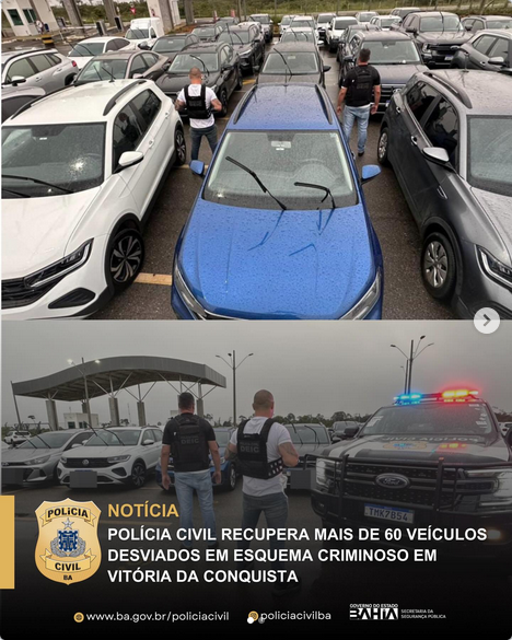 A Polícia Civil da Bahia, por meio da Delegacia de Repressão a Furtos e Roubos (DRFR/Vitória da Conquista), recuperou 68 veículos desviados da frota de uma locadora, no âmbito de investigação que apura crimes de estelionato e associação criminosa. O esquema vinha sendo praticado desde junho de 2025.