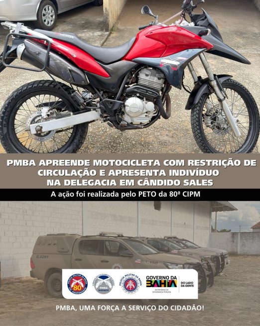Na manhã desta segunda-feira (30), o PETO, durante rondas ostensivas no bairro Primavera, na cidade de Cândido Sales – BA, visualizou um indivíduo conduzindo uma motocicleta sem o uso de capacete, sendo realizada a devida abordagem.