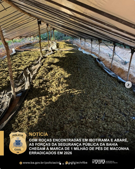 Com duas novas roças encontradas nas cidades de Ibotirama e Abaré, na manhã desta quinta-feira (23), as Forças da Segurança Pública da Bahia chegam à marca de 1 milhão de pés de maconha erradicados em 2026.