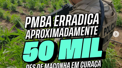 Na sexta-feira (19), a tropa da 45ª CIPM/Curaçá (@45.cipm), atuando na zona rural do município, no norte da Bahia, localizou e erradicou, aproximadamente, 50 mil pés de Cannabis sativa (maconha).
